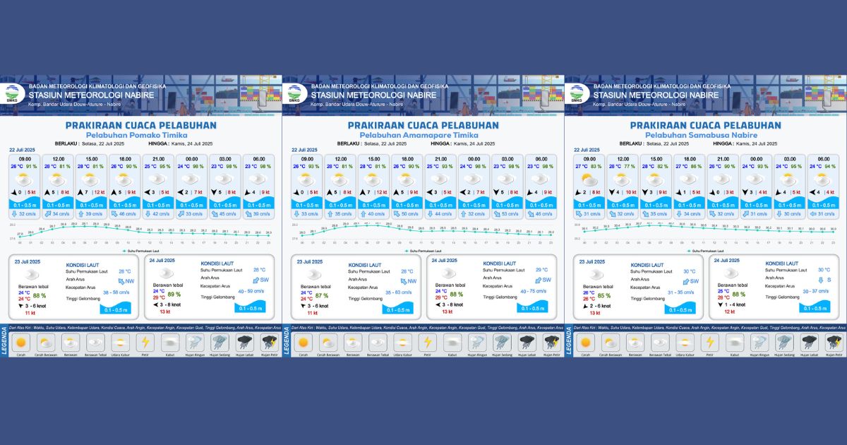 Periode prakiraan cuaca pelabuhan ini berlaku mulai Selasa, 22 Juli 2025 pukul 09.00 WIT hingga Kamis, 24 Juli 2025 pukul 09.00 WIT. Berikut rincian kondisi cuaca di sejumlah pelabuhan utama: