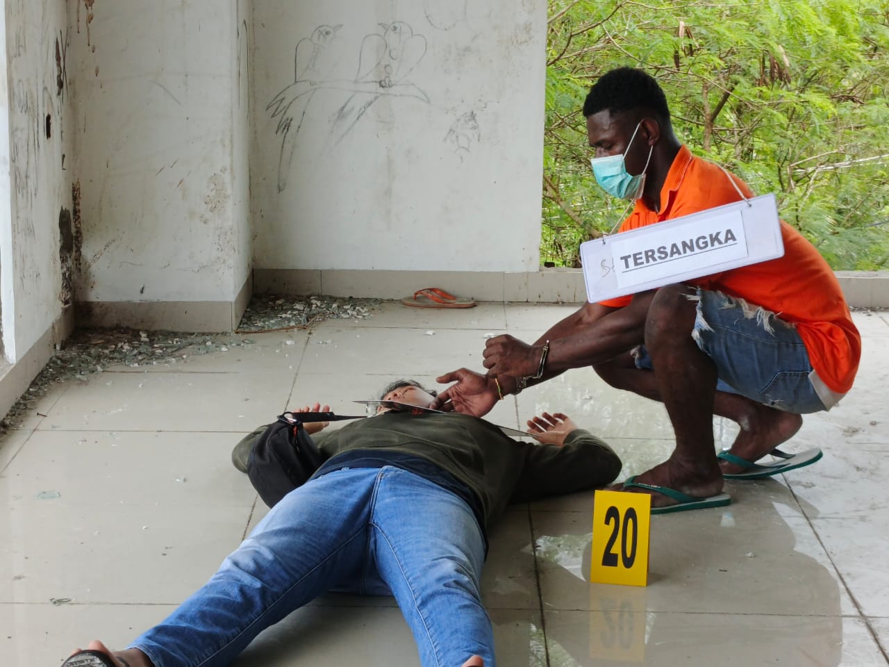 Timika, Antarpapua.com – Satreskrim Polres Mimika dan Polsek Mimika Baru menggelar rekontruksi kasus pembubuhan korban berinisial TAP di gedung perpustakaan Timika, Papua Tengah, Rabu (5/6/2024).